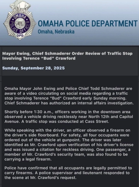 Відомого американського боксера Теренса Кроуфорда затримала поліція в місті Омаха (штат Небраска) в США у його день народження. На спортсмена наділи кайданки під дулом пістолета, але пізніше його відпустили. Про це повідомляє УНН з посиланням на публікацію в соціальних мережах та поліцію Омахи.