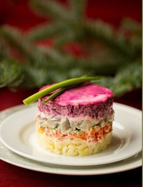 Оселедець нарізати кубиками, цибулю – дрібними шматочками. Овочі та яйця натерти окремо. Викласти на тарілку шарами: оселедець + цибуля, картопля + майонез, морква + майонез, яйця + майонез, буряк + майонез.