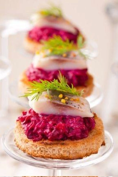 Приготування бурякового хумусу: збийте буряк + нут + часник + олію + лимонний сік + спеції в блендері до кремоподібної консистенції. Підсушіть хліб у тостері або на сухій сковороді. Намажте шар бурякового хумусу на кожен шматочок. Зверху покладіть шматочок оселедця. Прикрасьте зеленню та подавайте як закуску.