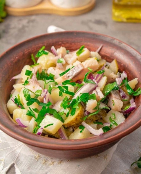 Картоплю наріжте кружальцями, оселедець — шматочками. Яблуко, огірки та цибулю наріжте кубиками. Сметану змішайте з гірчицею, сіллю та перцем. У глибокій мисці з’єднайте всі інгредієнти, заправте соусом. Перед подачею посипте зеленню.