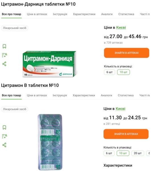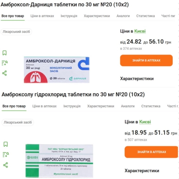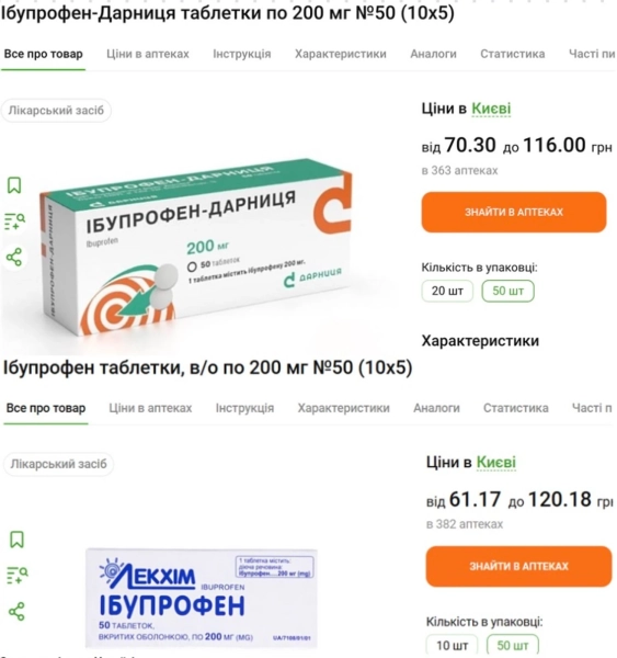 Наприклад, за даними сайту Tabletky.ua, популярний «Парацетамол» від «Дарниці» коштує 30,60 гривень, тоді як аналог від «Артеріуму» можна знайти за 19,05 гривень. «Ібупрофен» виробництва «Дарниці» продається за 70,30 гривень, а аналогічний препарат від «Лекхіму» коштуватиме 61,17 гривень. На ринку засобів від головного болю найвідоміший «Цитрамон-Дарниця» коштує 27 гривень, тоді як його найдоступніший аналог можна придбати за 11,30 гривень, що дає пряму економію 15 гривень. Серед заспокійливих препаратів «Валідол» від «Фармак» пропонується за 12,50 гривень, а виробництва «Дарниці» – за 14,80 гривень. Також можна обрати дешевший аналог ліків від кашлю «Амброксол», який актуальний для осінньо-зимового періоду: той, що виробляє «Дарниця», коштує 24,82 грн, тоді як аналог «Борщагова» дешевший – 18,95 грн. Особливо помітна різниця у популярному засобі від болю в горлі – «Септефрил» від заводу «Борщагів» продається за 44,48 грн, тоді як його аналог від «Дарниці» коштує 87,41 грн, тобто майже вдвічі дорожче.