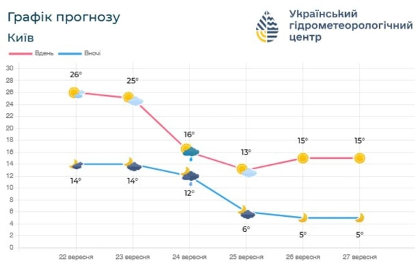 З 23 по 27 вересня в Києві та області очікується похолодання. 24 вересня вдень температура знизиться на 8-10°C, а вночі можливі заморозки на ґрунті.