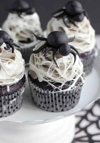 Змішати яйця, масло, цукор. В іншій мисці – борошно, какао, сіль. З’єднати вміст двох ємностей, додати шоколадні краплі. Розкласти у форми на ¾ і випікати 20-25 хвилин при 160 °C. Розтопити зефір 20-30 секунд у мікрохвильовці і нанести “павутину” на охолоджені мафіни. За бажанням – прикрасити іграшковими “павуками”.