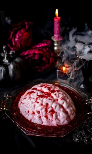 Зробити желе згідно з рецептом, але замінити частину води на вершки/молоко, щоб отримати ніжний рожевий колір. Вилити у форму і поставити в холодильник до застигання. Після затвердіння акуратно перекласти желе на тарілку. Полити “кров’ю” (сиропом чи барвником) для більшого ефекту.