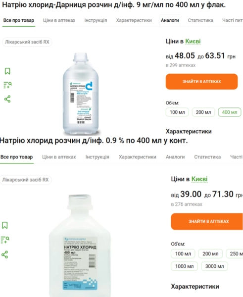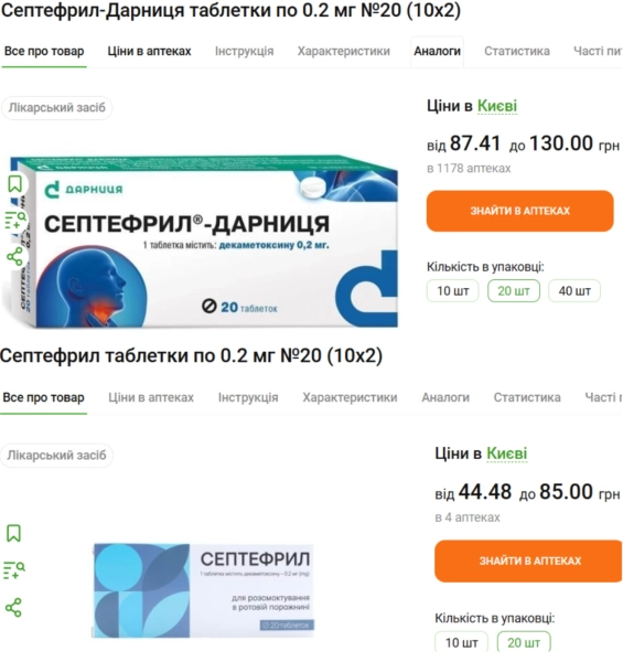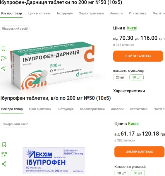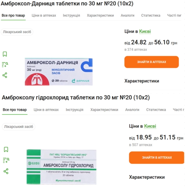 Різниця стає ще помітнішою на прикладі препарату «Цитрамон»: колись найвідоміший на ринку «Цитрамон-Дарниця» продається за 27 гривень, тоді як його найдешевший аналог доступний за 11,30 гривень, що економить українцям понад 15 гривень. «Септефрил» від «Борщагівського заводу» також продається вдвічі дешевше за «Дарницю» – він коштує 44,48 гривень. Виникає логічне питання – навіщо купувати той самий препарат лише із зеленим написом бренду на упаковці, та ще й вдвічі дорожче – за 87,41 гривень? Схожа ситуація склалася з «Амброксолом» – препарат від «Дарниці» коштує 24,82 гривні, а аналог від Борщагівського заводу – 18,95 гривень. Навіть звичайний «фізрозчин» від «Дарниці» коштує 48,05 гривень, а від «Юрія-Фарм» – 39 гривень.