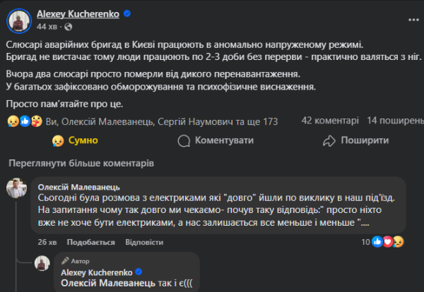 У Києві ремонтні групи працюють в дуже інтенсивному режимі, без відпочинку по 2-3 дні, що веде до сумних наслідків